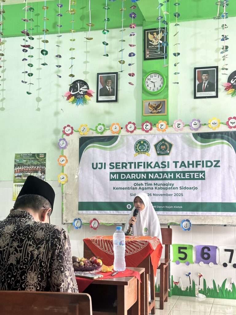 Pada Rabu, 26 November 2025, MI Darun Najah Kletek melaksanakan Uji Sertifikasi Tahfidz yang bekerjasama dengan Kementrian Agama Kabupaten Sidoarjo. Kegiatan yang menyasar kelas akhir pada setiap jenjang madrasah di lingkungan Kemenag ini, menjadi salah satu usaha dari MI Darun Najah guna memberikan apresiasi dan motivasi kepada siswa-siswi yang memiliki hafalan Al Quran 2 Juz atau lebih.